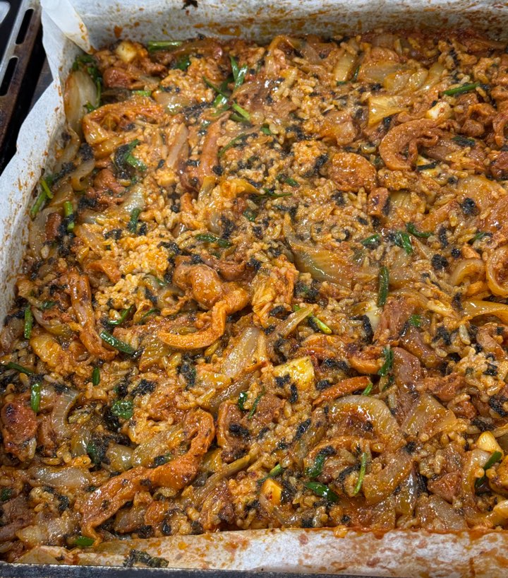 매콤한 양념이 어울러진 오리고기와 양파가 눈에 띄며 추가적으로 고기를 다 먹은 후 볶음밥도 먹기 위해서 추가하였습니다.
