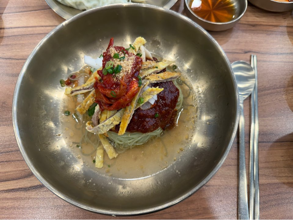 양념장과 같이 비벼먹는 비빔 냉면의 느낌이 났고 명태회 무침과 육전의 양이 많지는 않았지만 새콤달콤한 비빔 냉면의 맛이 좋았습니다.