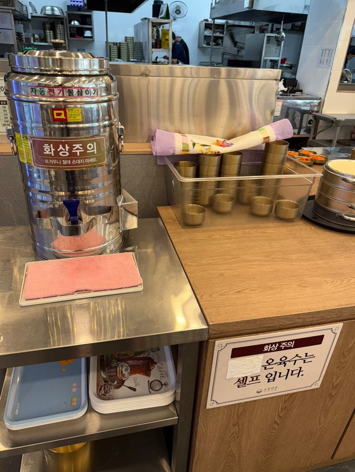 셀프 코너에는 메인 음식을 기다리면서 마실 수 있는 온육수 셀프 코너가 있었습니다. 차가운 냉면 음식을 먹기 전에 온육수를 마시면 정말 좋은 것 같습니다.