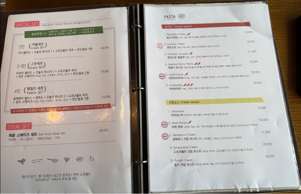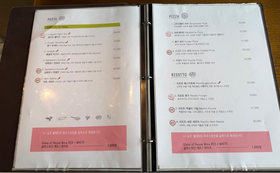 파스타, 피자, 리조또 등 메인 메뉴들을 볼 수 있었습니다.