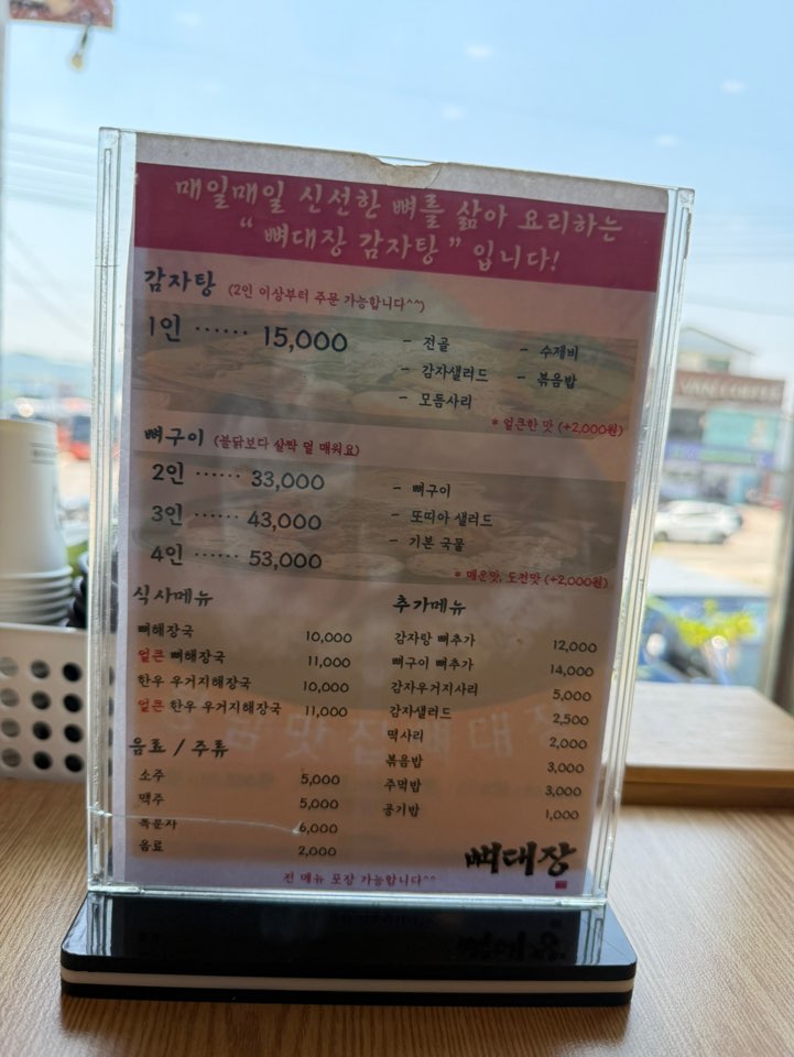 뼈대장감자탕의 경우 "천연당"만을 사용하며 염도계를 사용한 적절한 간 맞춤, 5성급 호텔쉐프 출신의 노하우로 매일 건강하고 신선한 식재료를 엄선한다는 내용이 벽면에 아주 크게 붙어져 있었습니다.