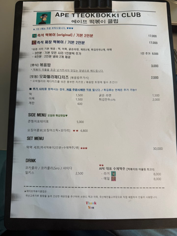 1인 1메뉴 주문이 필요하며 즉석떡볶이[original] 기본 2인분과 떡볶이 국물에 찍어먹을 수 있는 튀김을 고민해보았습니다. SIDE MENU에서 오징어 튀김 맛집이라고 표시되어 있으며 오징어콤보[오징어스틱+오다리] 메뉴가 왕관 2개 표시가 되어있는 것을 보고 주문을 하였습니다.