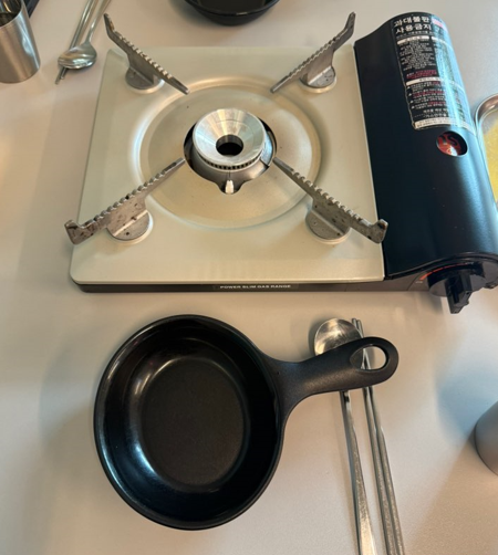떡볶이를 끓여먹을 수 있는 가스버너와 손잡이가 달려있는 그릇이 세팅 되었습니다.