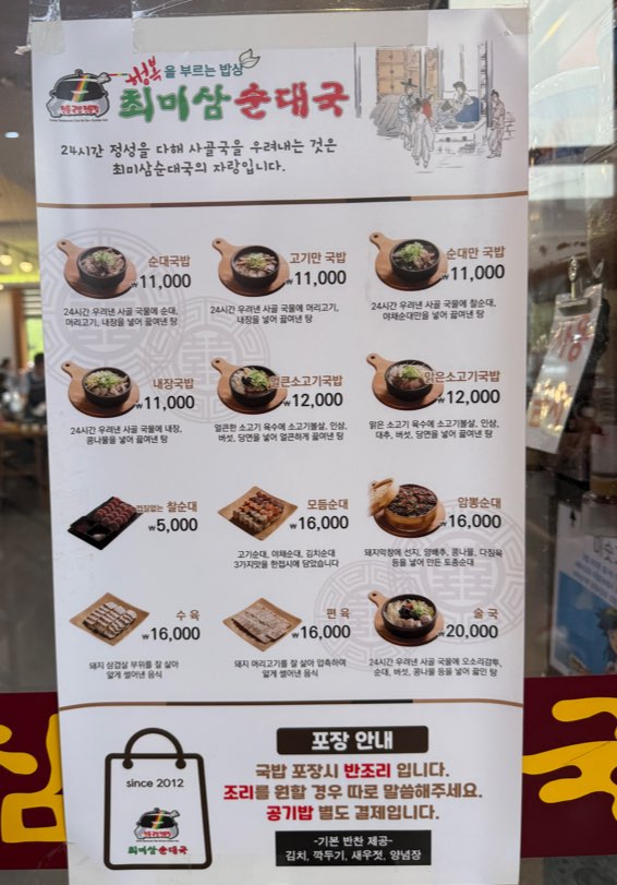 메뉴는 개인의 취향에 맞게 순대와 고기가 들어간 순대국밥, 또는 고기만 들어간 고기 국밥 등 취향에 맞게 고를 수 있었습니다. 순대국 외에도 내장국밥,얼큰소고기국밥, 맑은소고기국밥이 있었지만 가장 메인 메뉴인 순대국밥으로 주문했습니다.