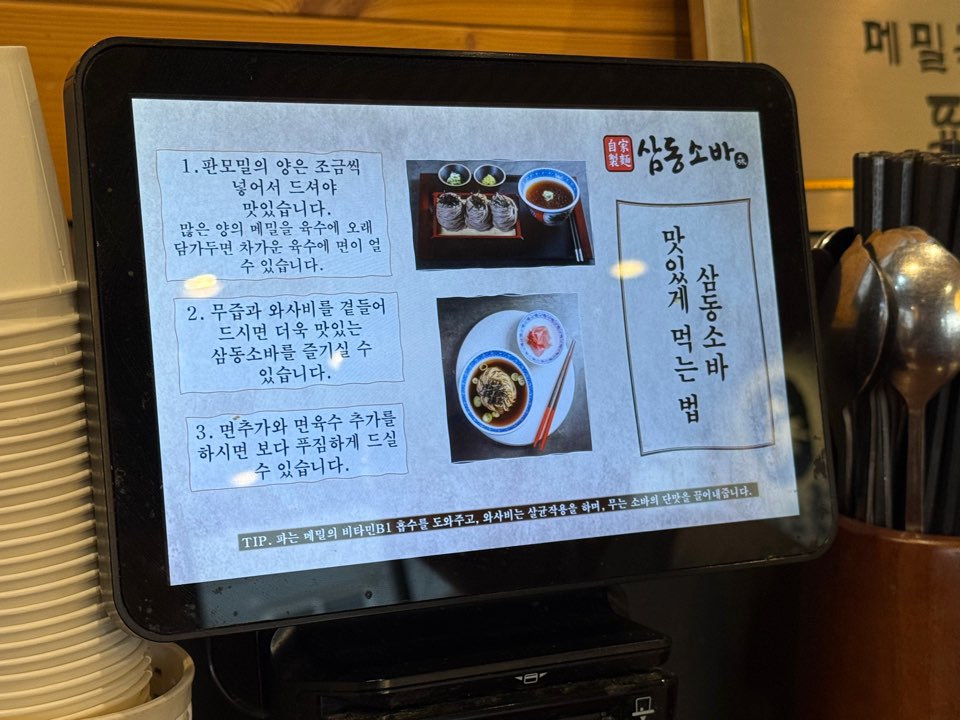 메뉴를 주문하기 전 키오스크에서 안내해주는 소바를 맛있게 먹는 방법에 대해서 알 수 있었습니다.